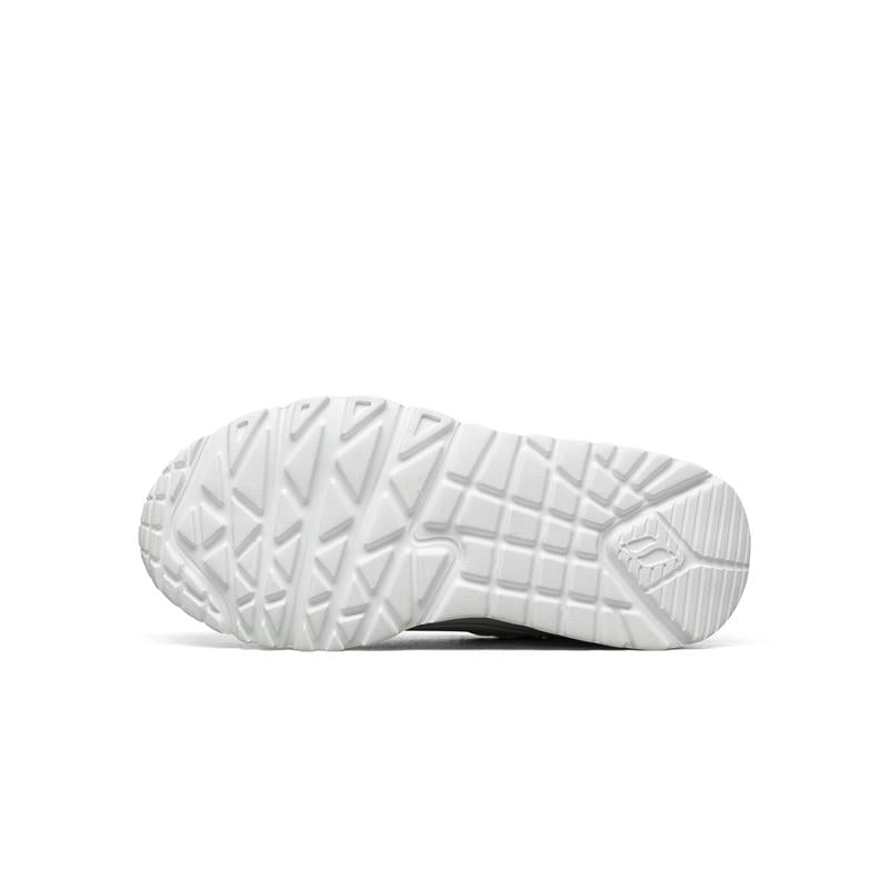 SKECHERS 魔術貼休閒鞋:採用輕質版的UNO系列UNO LITE大底,EVA材質,輕盈舒適;鞋面採用人造皮革材質,修飾腳型,簡潔的線條輪廓,秀氣大方;黑白淨色配色,基礎百搭,是小朋友校園穿搭的必備單品之一;一片式搭帶方式,方便小朋友穿著; AIR-COOLED 記憶鞋墊,爲腳部提供更好的舒適性。